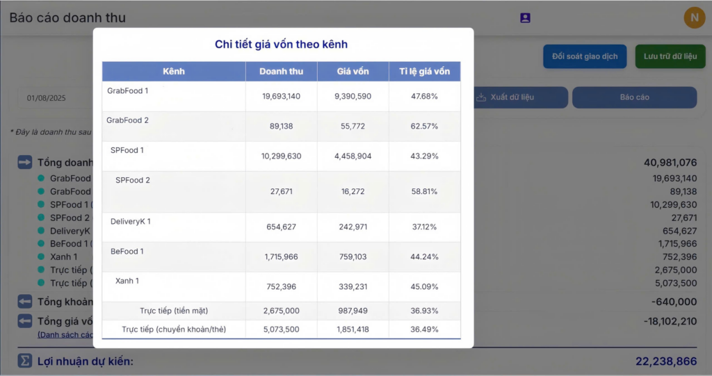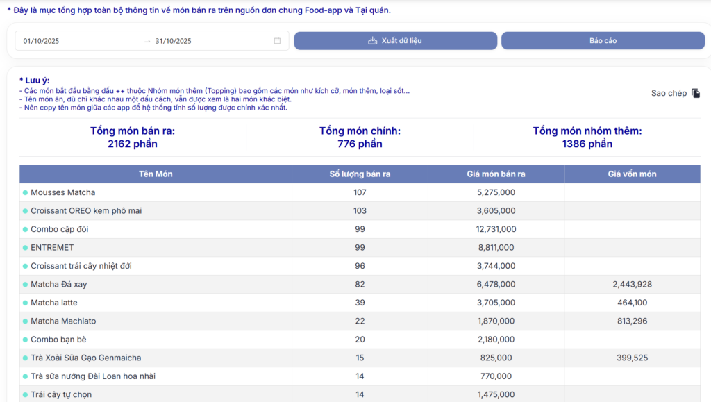 - Hệ thống kiểm soát chính xác tổng lượng món bán ra trên các kênh: