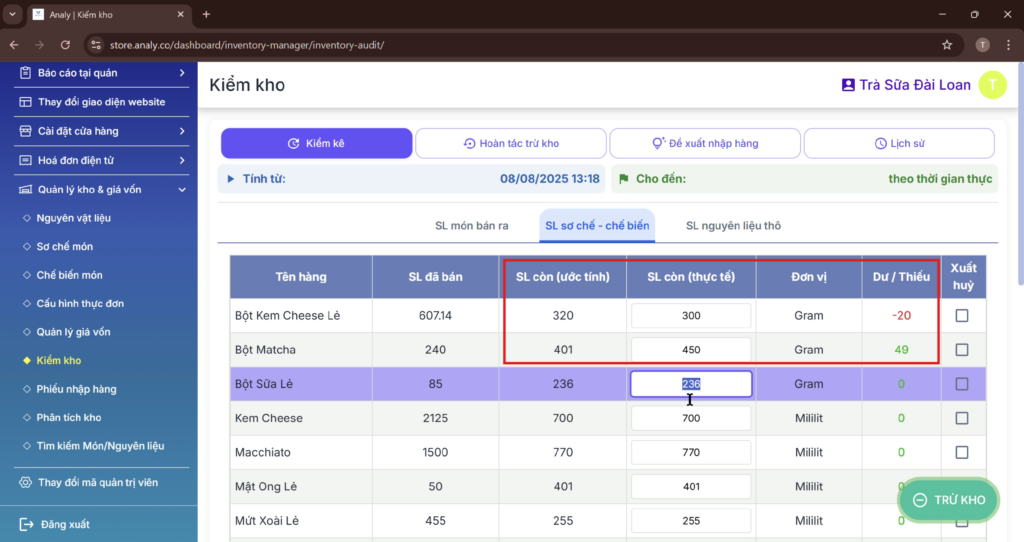 Mọi hoạt động kiểm kho => trừ kho => nhập hàng đều được ghi lại theo thời gian thực, đảm bảo nhân viên không thể tự ý thay đổi số liệu. Chủ quán có thể xem lại lịch sử thao tác bất cứ lúc nào.