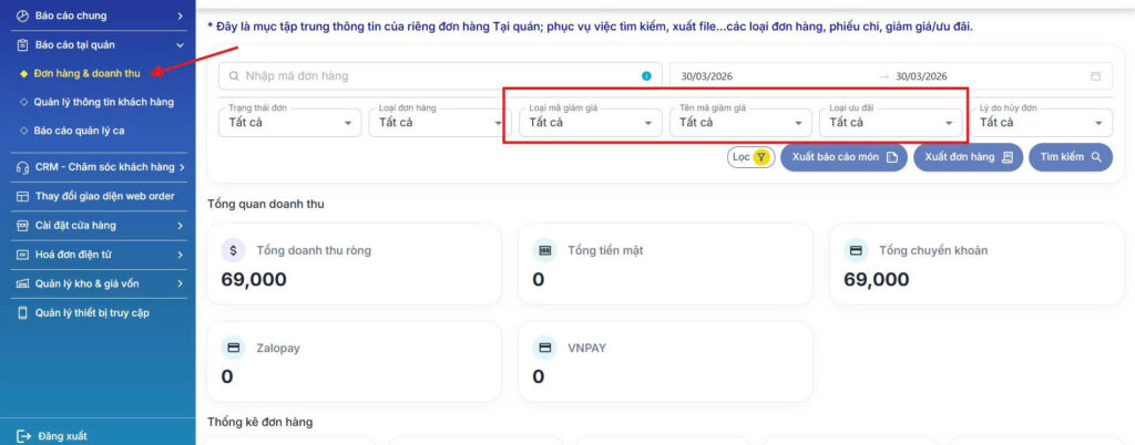 Mục Đơn hàng và doanh thu >> chọn filter đơn hàng tại các mục Loại mã giảm giá, Tên mã giảm giá, Loại ưu đãi….để xem chi tiết các đơn hàng được áp dụng các chương trình.