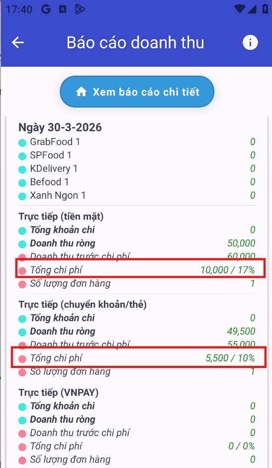 ➡️ Tổng chi phí: Là con số tổng của các khoản % chiết khấu quán ký với app + tất cả các chương trình khuyến mãi có trong đơn hàng + thuế khấu trừ + Chi phí quảng cáo phát sinh trong mục Giao dịch