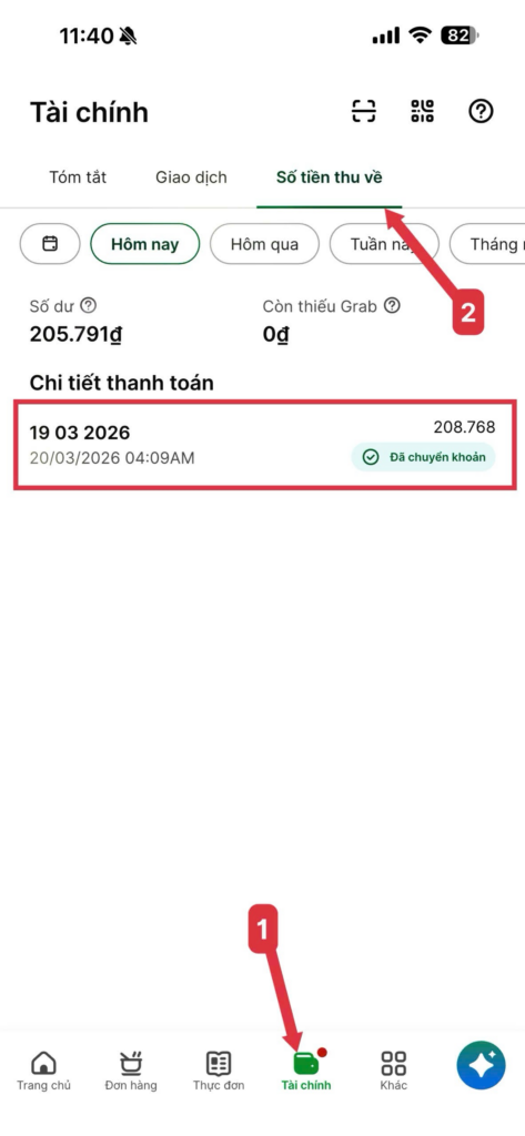 Đối chiếu số tiền doanh thu ròng trong Analy tại mục này của app Grab Merchant: