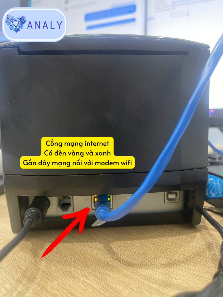 Máy in: Cần cắm dây cáp mạng tới modem wifi chính của quán, đảm bảo đèn chỗ cáp mạng sáng. Không cắm dây mạng vào modem phụ chia từ modem chính. Không cắm vào máy tính. Không sử dụng cho wifi phát bằng sim 4G.