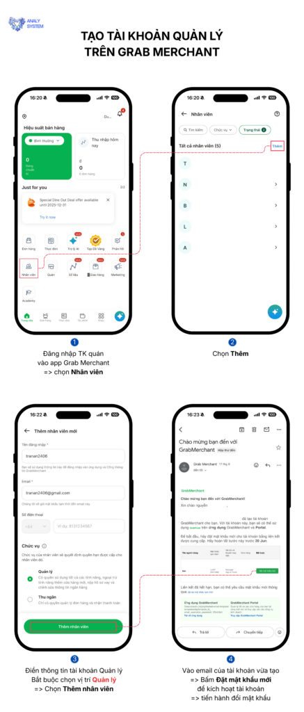 Để đăng nhập tài khoản Grabfood của quán vào hệ thống của Analy, quán cần tạo tài khoản vị trí Quản lý riêng biệt, không tạo tài khoản Nhân viên để: