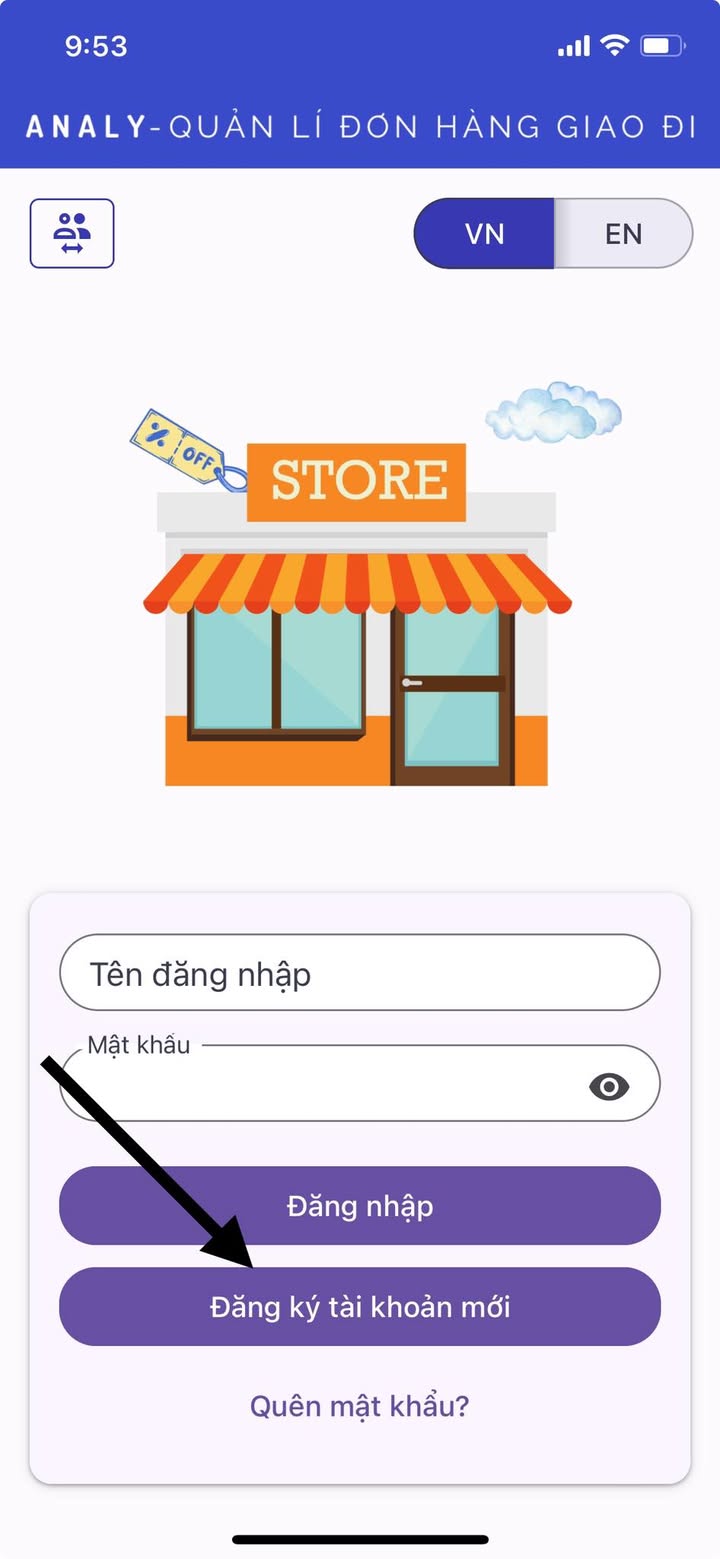 Bước 1: Tải app Analy lên điện thoại của bạn (android, ios) hoặc thiết bị nhận đơn của quán như máy pos, window pc. Bấm Đăng ký tài khoản mới là sẽ có ngay tài khoản dùng thử miễn phí 7 ngày với đầy đủ các tính năng.