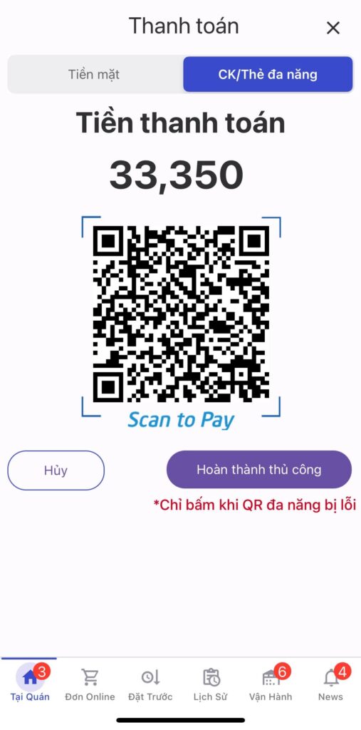 - Tích hợp mã QR thanh toán offline vào tài khoản: Thì bill sẽ in ra mã QR thanh toán, chứa thông tin số tài khoản ngân hàng của quán. Nhưng hệ thống sẽ không thông báo trạng thái giao dịch thành công chưa, người dùng cần tự đối chiếu trên app ngân hàng và hoàn thành đơn hàng.