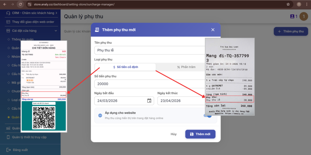 Vào các dịp đặc biệt như lễ, Tết,… các quán thường có nhu cầu áp dụng thêm phụ thu để bù chi phí và đảm bảo vận hành. Tính năng phụ thu giúp quán thiết lập và áp dụng các khoản phí này một cách nhanh chóng, tự động và chính xác.