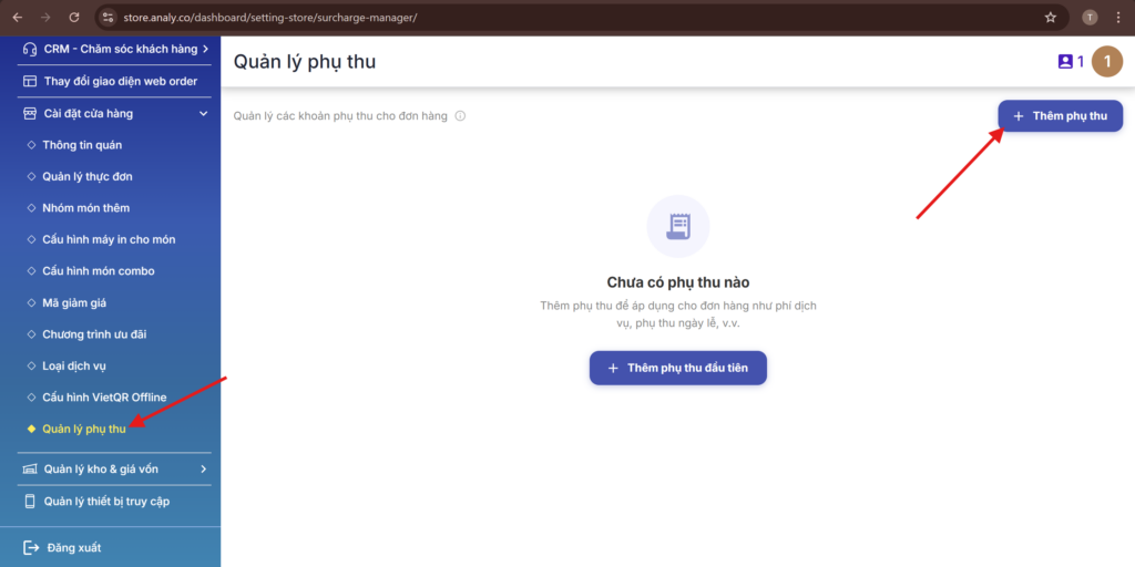 - Để tạo phụ thu cần đăng nhập tài khoản Analy vào trang Quản lý cửa hàng: https://store.analy.co/, vào mục Quản lý phụ thu.