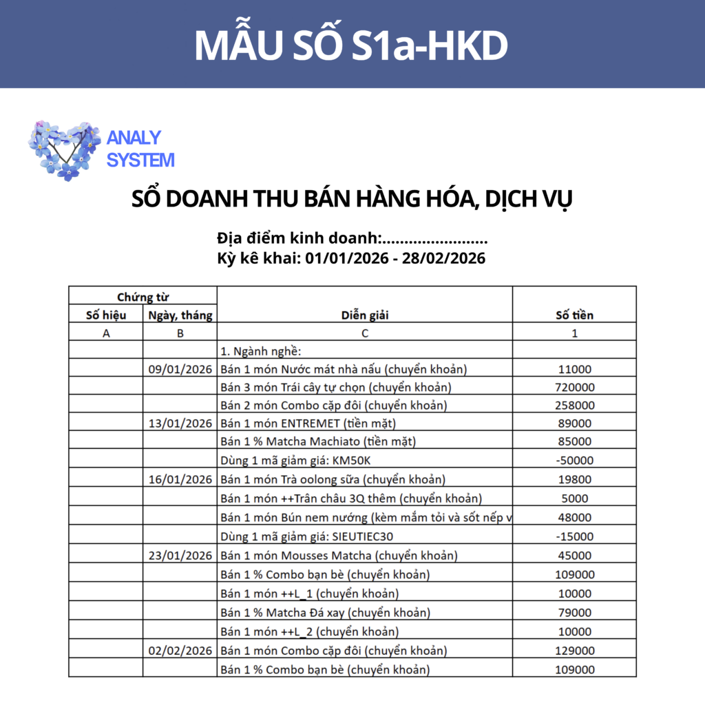 Sổ doanh thu bán hàng hóa, dịch vụ sẽ được tổng hợp trực tiếp số lượng đơn hàng từ tất cả các kênh Food-app, tại quán và web order (nếu có). dữ liệu bán hàng trên hệ thống chuẩn mẫu kê khai S1a-HKD, giúp giảm thời gian ghi chép thủ công và hạn chế sai sót.