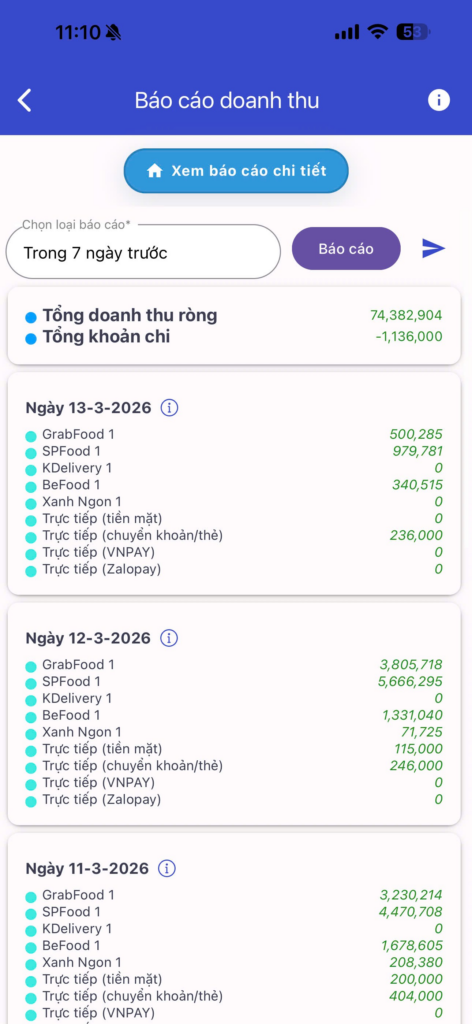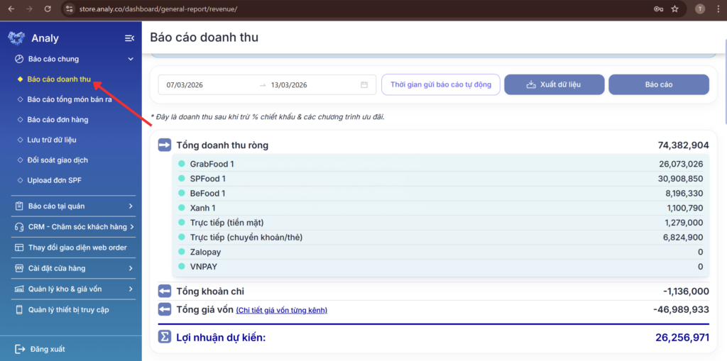 - Báo cáo doanh thu trên trang Quản lý cửa hàng: