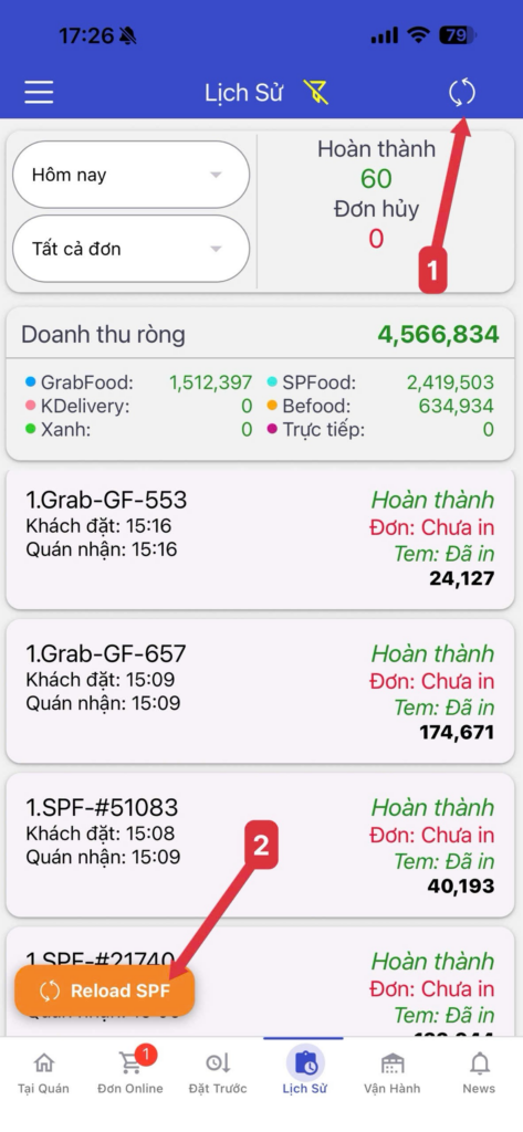 Trước khi tải sổ báo cáo, cần load dữ liệu đơn hàng trong mục Lịch sử để hệ thống cập nhật đầy đủ doanh thu.