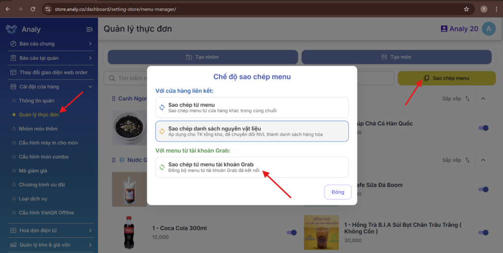 Bước 2: Để tạo thực đơn: => Analy có thể copy menu từ tài khoản Grab về menu Tại quán, sau đó quán chỉ cần điều chỉnh giá bán trực tiếp. Hoặc quán có thể vào mục Quản lý thực đơn để chủ động tạo Menu.