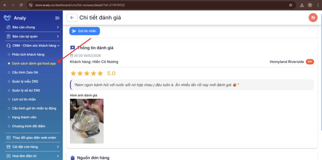 - Trên trang Quản lý cửa hàng: Đăng nhập tài khoản vào trang: https://store.analy.co/ => vào mục danh sách đánh giá food-app