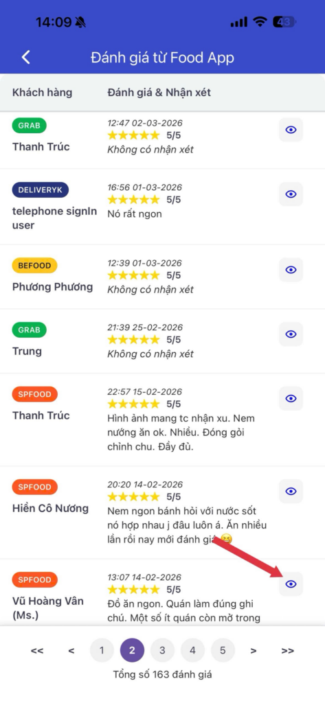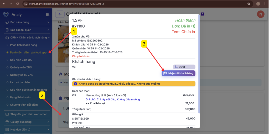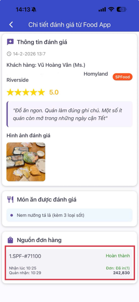 Hệ thống tổng hợp toàn bộ đánh giá của khách trên các kênh Food App (SPF, Grabfood, Befood, DeliveryK, Xanh ngon), nhận xét khách hàng để chia sẻ nội bộ trong cộng đồng người dùng, theo dõi lại lịch sử mua hàng và sở thích của khách.