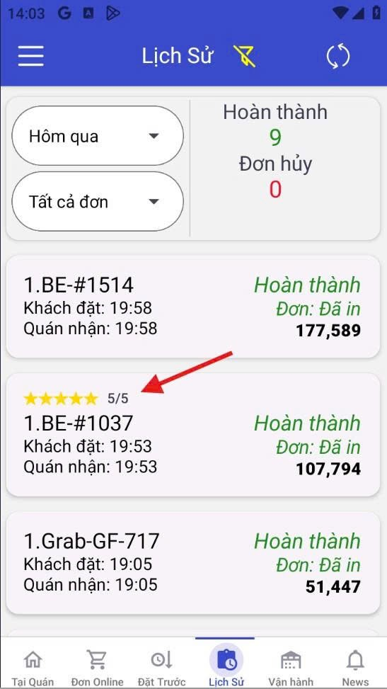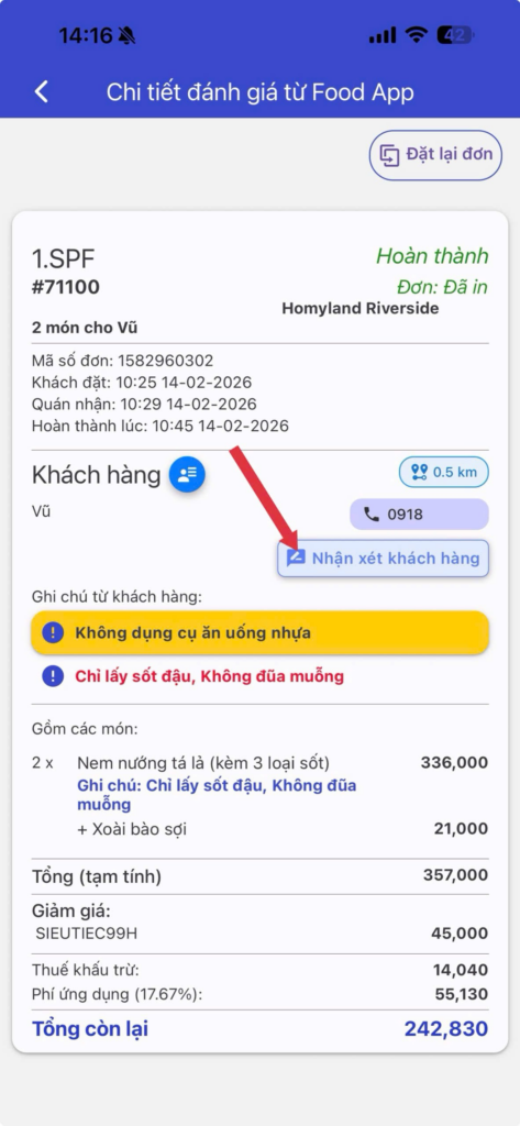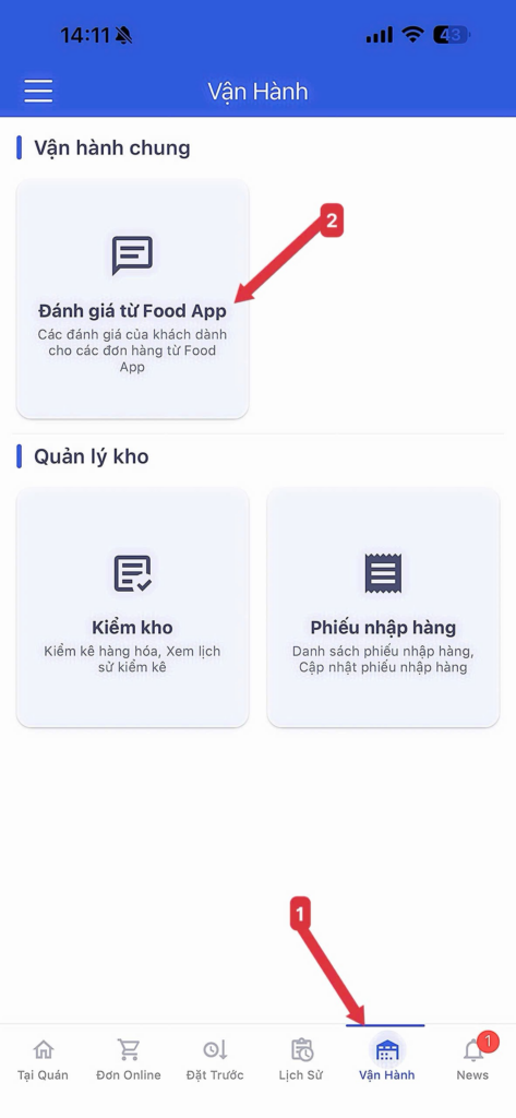 - Trên app: Vào tab Vận hành => chọn Đánh giá từ Food-app