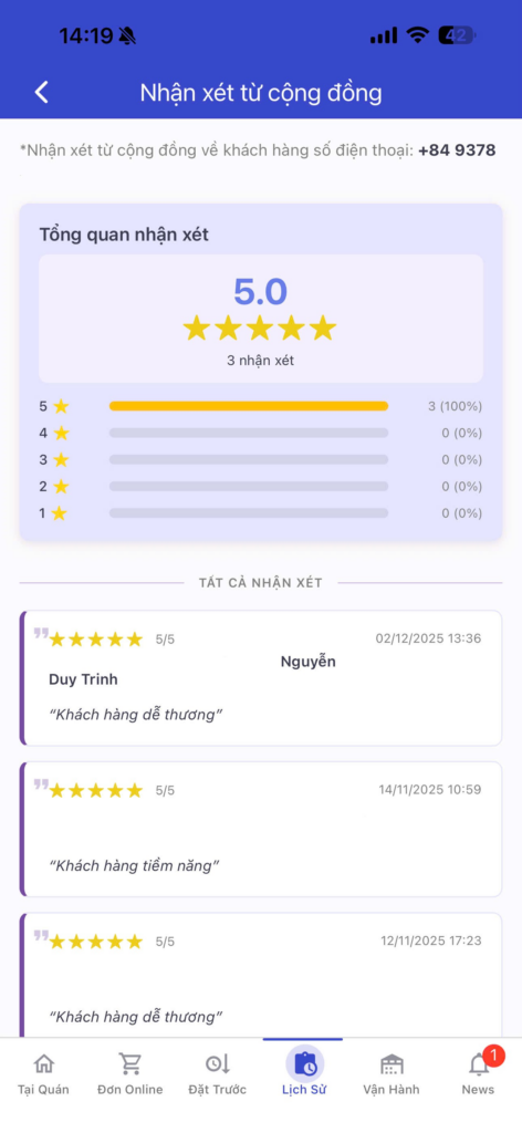 Tại đây, quán có thể xem nội dung đánh giá được sắp xếp theo thời gian. Với tài khoản chưa đăng ký tính năng CRM chính thức có thể xem đánh giá trong 7 ngày gần nhất, tài khoản đã đăng ký tính năng CRM chính thức có thể xem được toàn bộ lịch sử đánh giá (tối đa 7 ngày trước ngày đăng ký chính thức) và lưu trữ lâu dài.